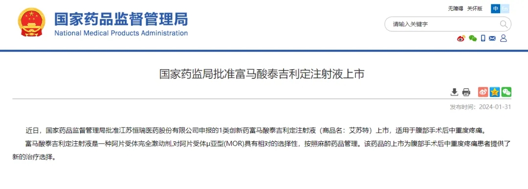 2024年1月31日,中國國家藥品監(jiān)督管理局(NMPA)官網(wǎng)宣布批準恒瑞醫(yī)藥1類創(chuàng)新藥“富馬酸泰吉利定注射液”(商品名:艾蘇特)上市,適應癥為腹部手術(shù)后中重度疼痛。